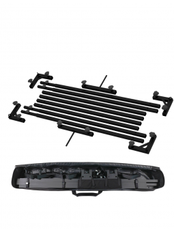 Butterfly Pin Set firmy Udengo zawiera wszystkie elementy potrzebne do zbudowania stabilnej , lekkiej ramy. Został zaprojektowany tak, aby zapewnić szybki montaż i montaż. Możesz go użyć do podtrzymania jedwabiu , kraty lub innych tkanin modyfikujących światło . Rozmiar ramy można zmieniać dodając lub usuwając kwadratowe rurki - np. dodanie dwóch rur 4' da ci ramę 12' x 8'. Zestaw pinów zawiera dwa proste złącza z pinami 16 mm , kompatybilne z większością głowic dostępnych na rynku.