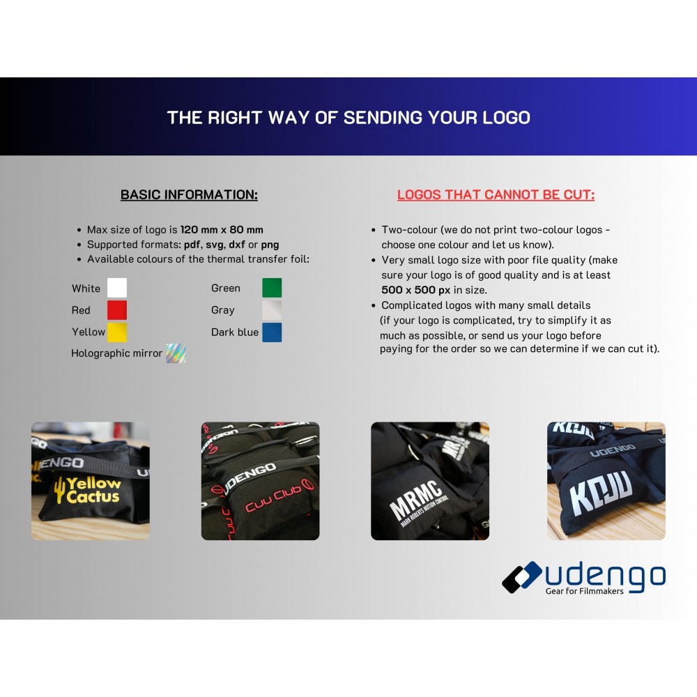 Logo wykonujemy techniką termotransferu. Maksymalny rozmiar 120mm x 80mm. Po złożeniu zamówienia prześlij nam grafikę. Obsługiwane formaty: PDF, SVG i DXF lub PNG. Czas dostawy trwa 2-3 dni.