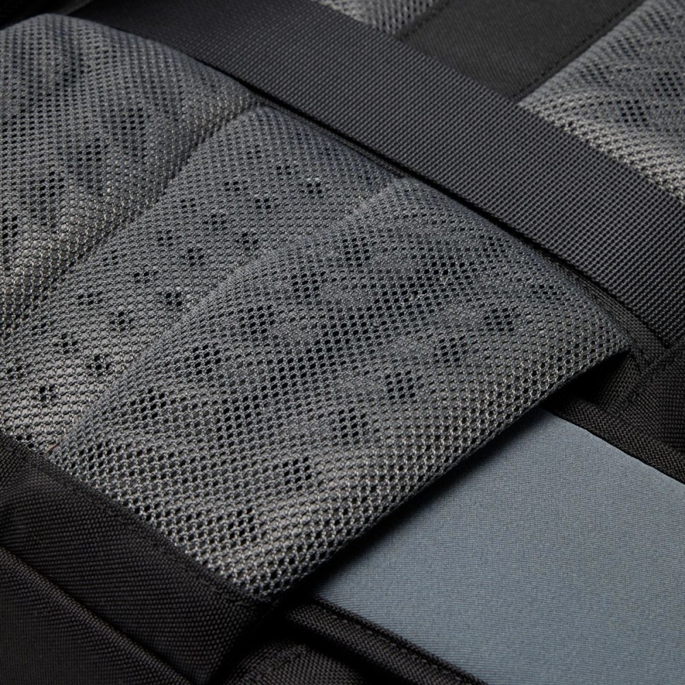 Został wykonany z tkanin pozyskanych w procesie recyklingu: nylonu ripstop 210D oraz poliestru 600D i 900D. Materiały te charakteryzują się bardzo wysoką odpornością na ścieranie, rozrywanie, są szybkoschnące, odporne na wilgoć. W razie wyjątkowo trudnych warunków atmosferycznych, jak ulewny deszcz, do zestawu dołączono pokrowiec przeciwdeszczowy. Dodatkowo czarny kolor, minimalistyczny design i specjalnie dobrana tkanina sprawiają, że plecak nie rzuca się w oczy i jest łatwy w czyszczeniu.