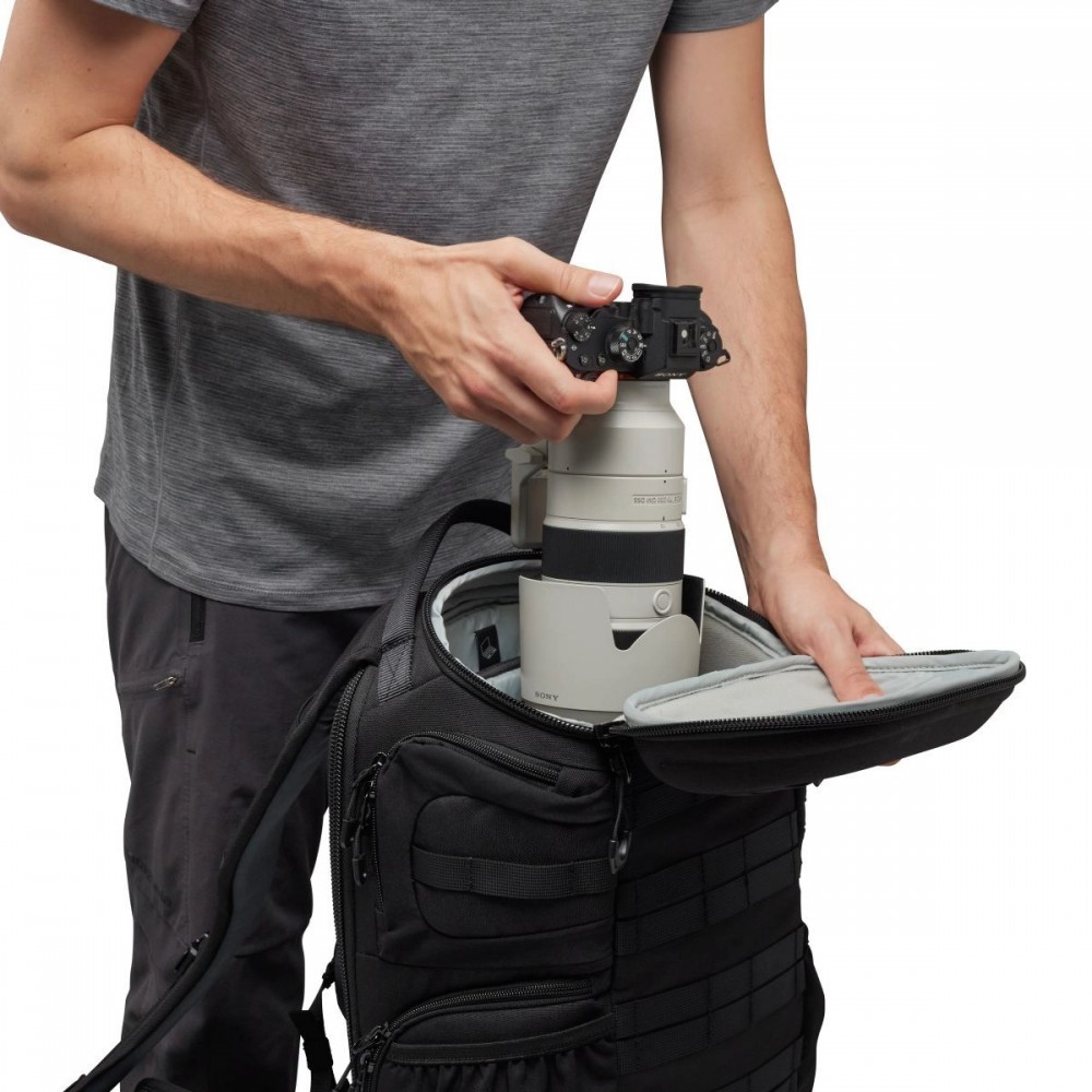 Plecak dopasowuje się do wielu fotograficznych zadań, również dzięki czterem punktom dostępu. Szybki dostęp boczny pozwala na wyciągnięcie aparatu bez zdejmowania plecaka. Zamek znajduje się po obu stronach, co jest wygodne również dla osób leworęcznych. Górny dostęp idealnie sprawdzi się podczas pracy z długim teleobiektywem – umożliwia wyjęcie aparatu bez konieczności otwierania całego plecaka. Pełny dostęp z tyłu pozwala na kompleksową organizację całego wyposażenia.
